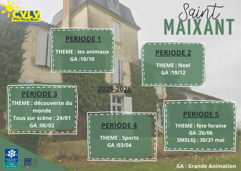 L’accueil périscolaire de St Maixant se déroule dans les locaux de l’école maternelle et peut accueillir jusqu’à 100 enfants : 50 enfants de plus de 6 ans et 50 enfants de moins de 6 ans. Il comporte deux grandes salles ainsi qu’un coin sanitaire.